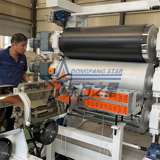 دستگاه ساخت اکسترودر تک پیچ ورق پی وی سی نرم : تجهیزات عمدتاً از یک اکسترودر تک پیچ 120، یک تقویم سه غلتکی، یک براکت خنک کننده، یک دستگاه کشش غلتکی لاستیکی، یک دستگاه برش و یک دستگاه تشکیل شده است.