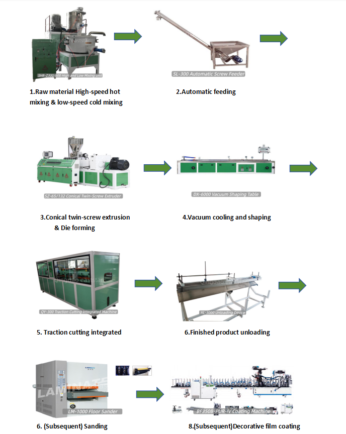 پلاستیک سازی قدرتمند و کارآمد:هسته از اکسترودر دو پیچ مخروطی SZ-65/132 استفاده می کند، با پیچ های دوقلو که به طور همزمان در جهات مخالف می چرخند. دارای عملکردهای تغذیه اجباری و خود تمیز شوندگی است که دارای اثر پلاستیک سازی عالی بر روی فرمولاسیون پودر SPC و راندمان خروجی بالا است.